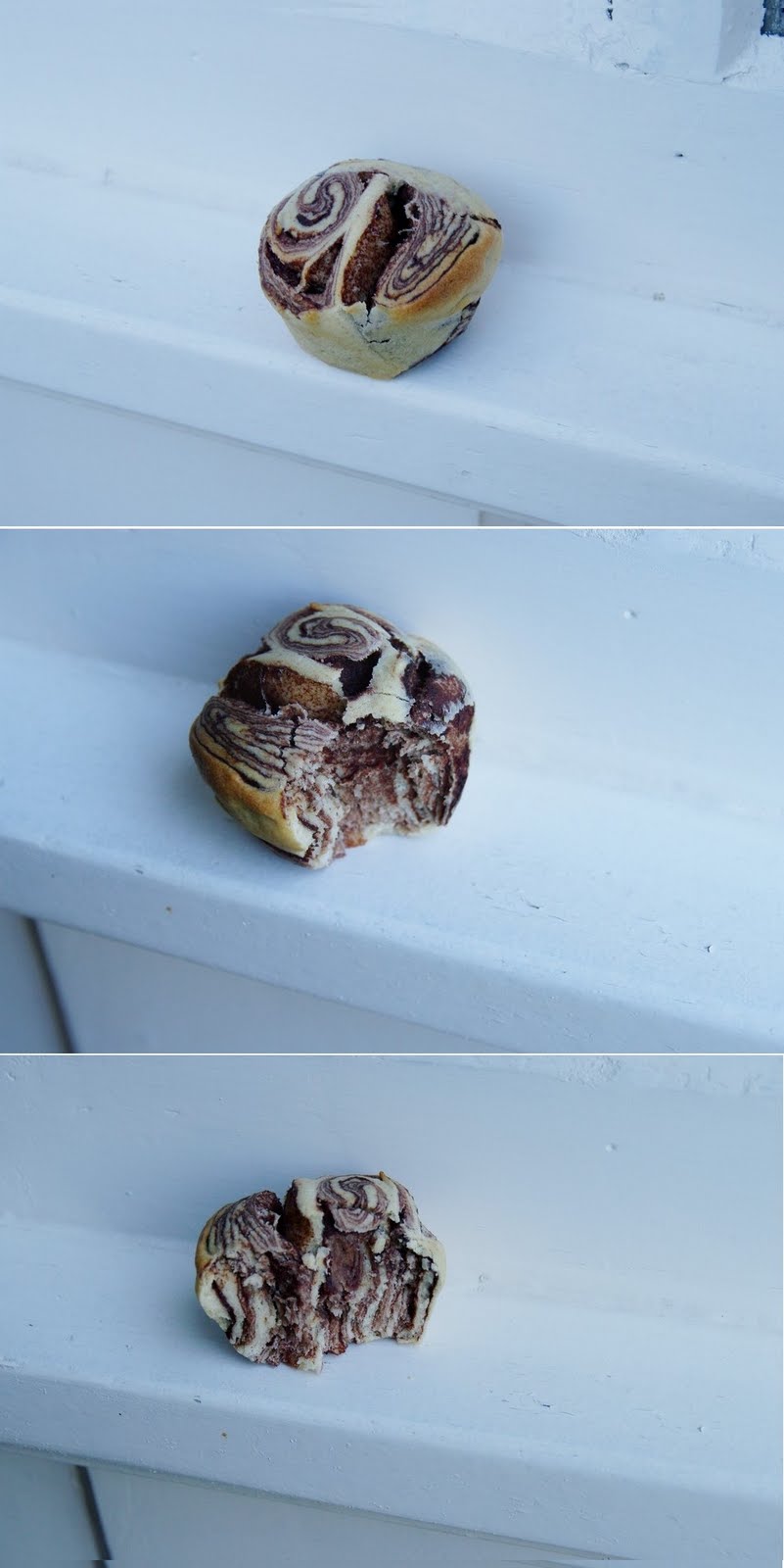 Cette recette est issue de là, blog dans lequel vous aurrez une illustration de la façon de rouler la pâte, que je n'ai pas recopier ici car je n'en ai surement pas le droit mais qui est très pratique pour bien comprendre comment on fait et nous rend le truc tout facile (dans ce blog, la recette est la même mais avec du thé vert matcha à la place du cacao) !